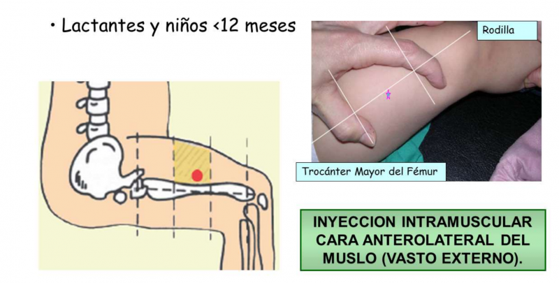 Inyeccion en el muslo. Coloque la palma de la mano sobre el área frontal del muslo donde se une a la entrepierna. El tercio medio es dónde se aplica la inyección. Verifique el nombre del medicamento en la ampolla y su concentración.